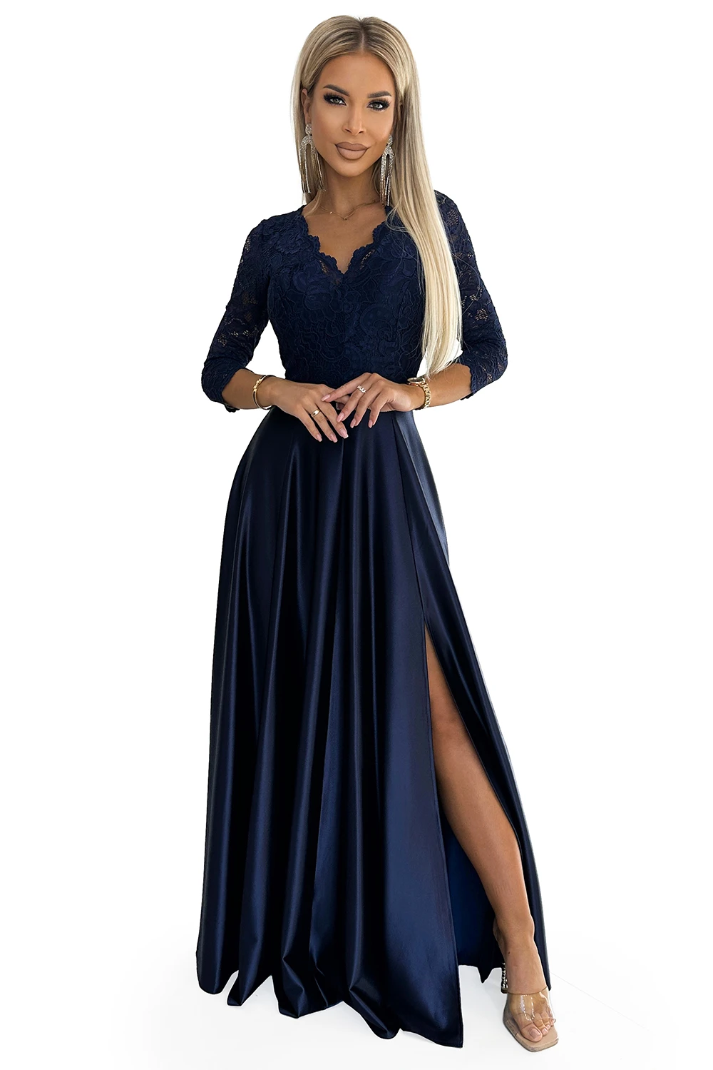 309-7 AMBER koronkowa długa SATYNOWA suknia z dekoltem - GRANATOWA