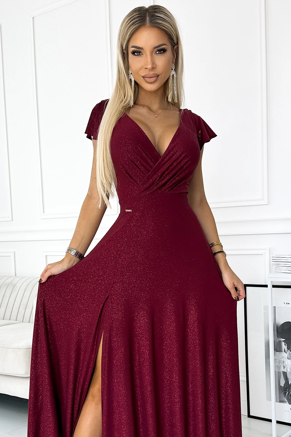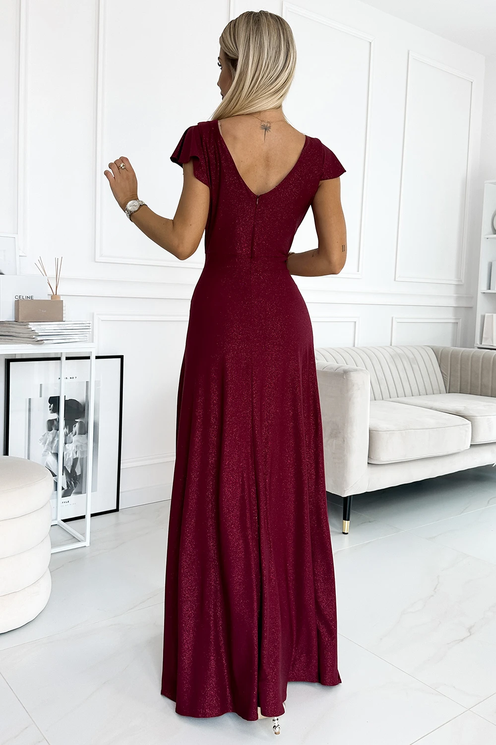 411-8 CRYSTAL połyskująca długa suknia z dekoltem - BORDOWA