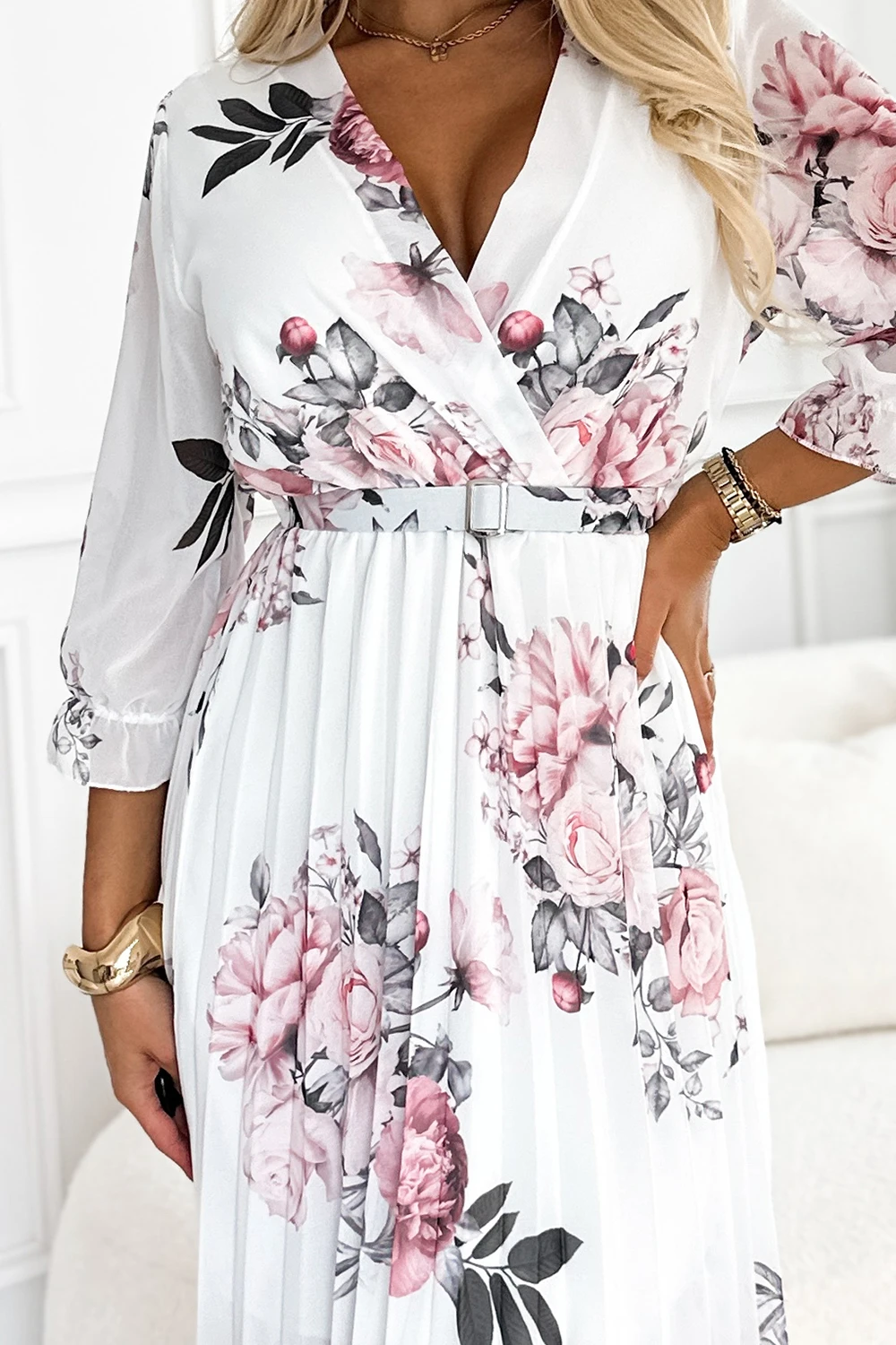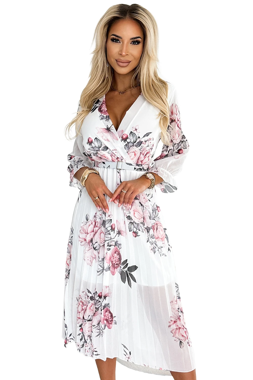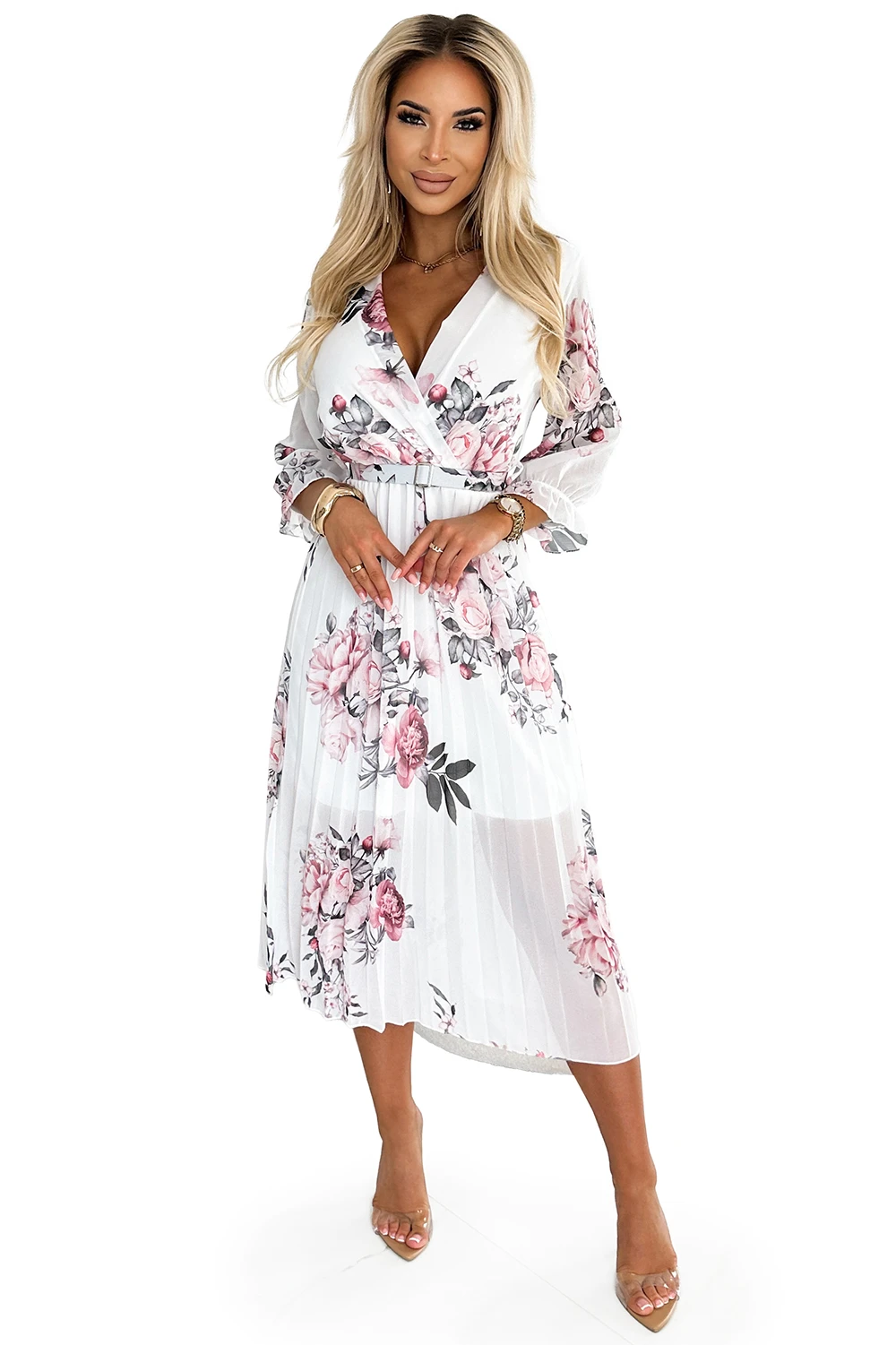 448-2 YUNA Plisowana sukienka midi z dekoltem i paskiem - RÓŻE na białym tle