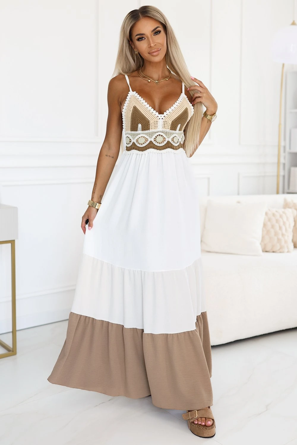 612-1 Długa beżowo-biała sukienka na ramiączkach z szydełkową górą - boho