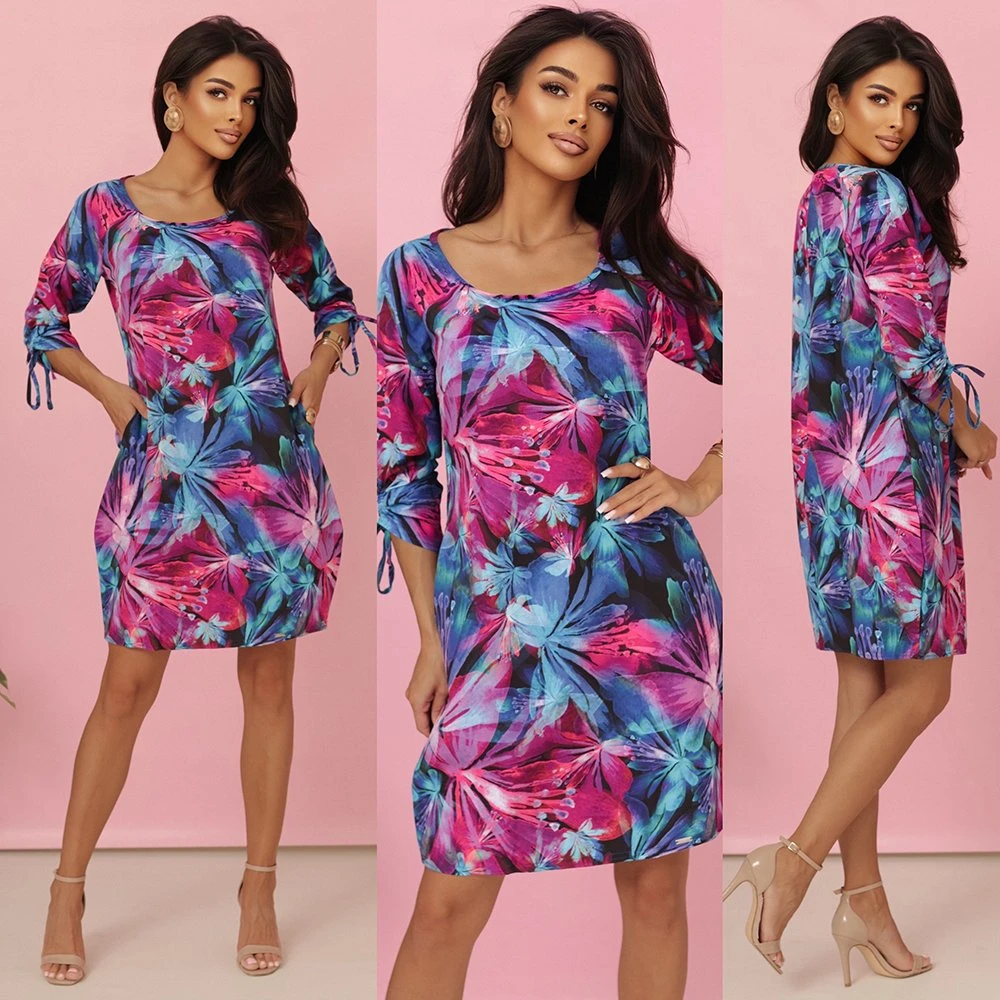 Sukienka posiada rękawy 3/4 z uroczym wiązaniem, co dodaje lekkości i dziewczęcego uroku. Wykonana z wysokiej jakości materiału, idealnie sprawdzi się na wakacje, letnie wyjścia, spacer po plaży czy spotkanie z przyjaciółmi.