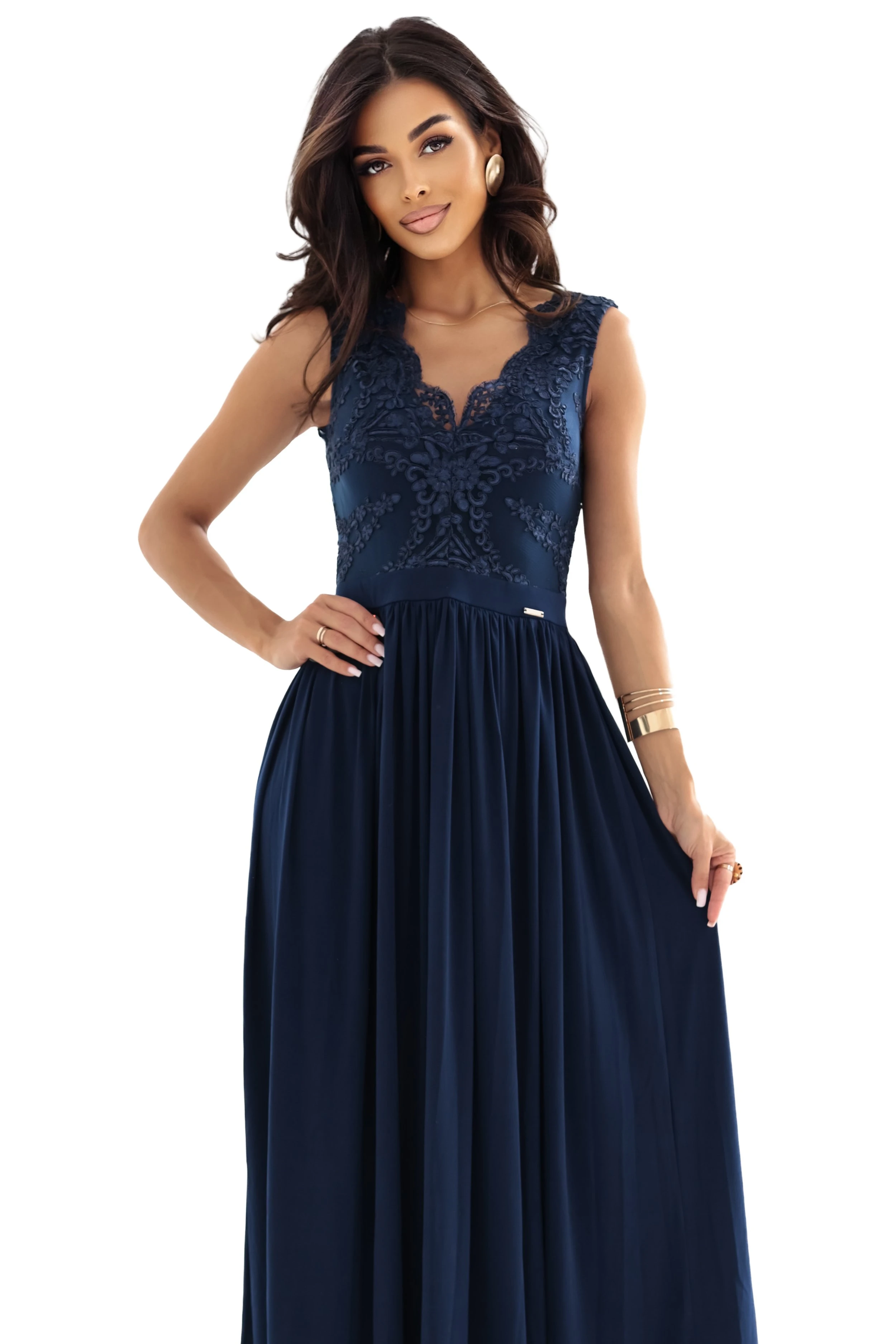 215-6 LEA długa elegancka suknia maxi z koronkową górą i rozcięciem na nodze - granatowa