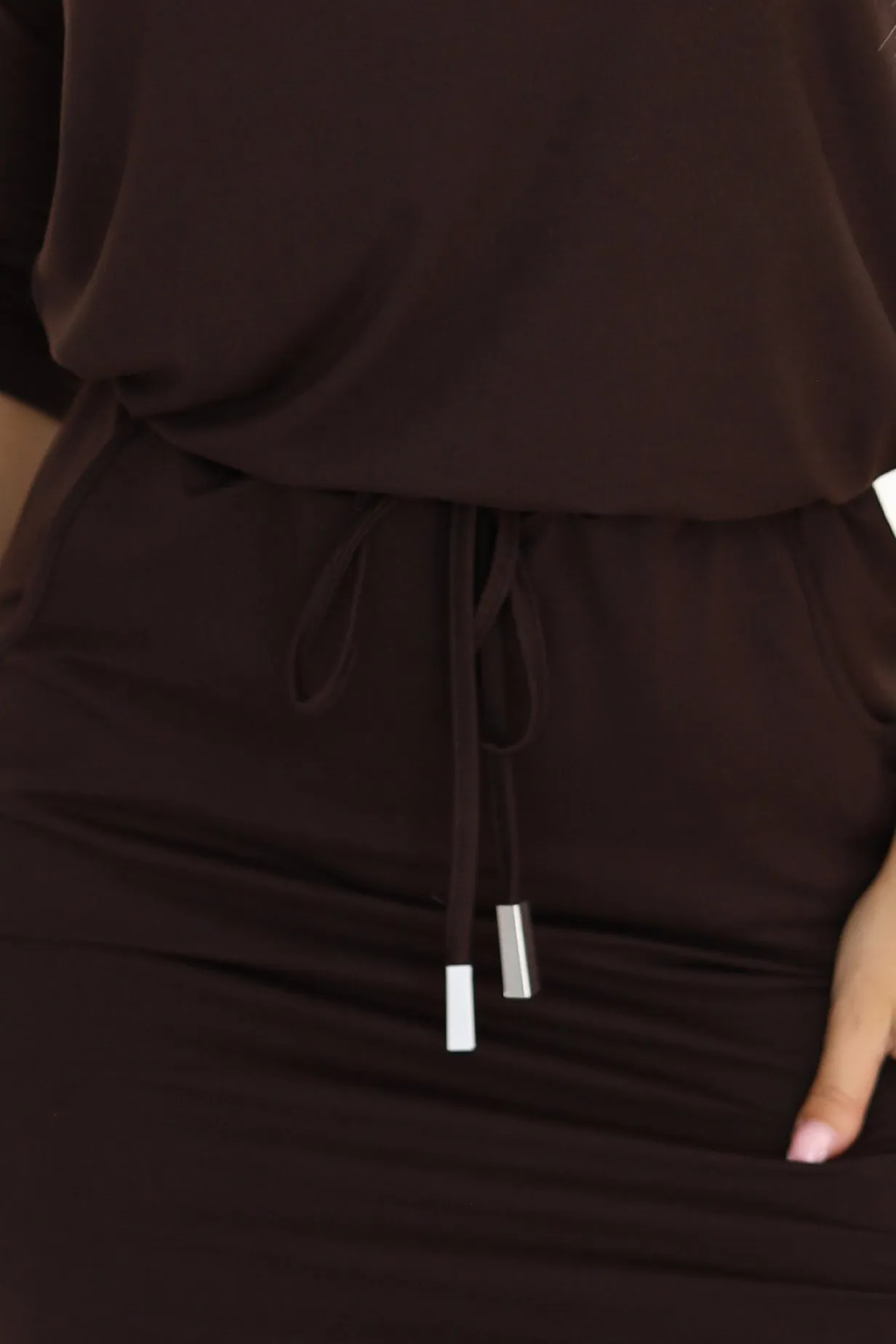 13-169 Sportowa sukienka midi z kieszonkami i wiązaniem w pasie - czekoladowy brąz