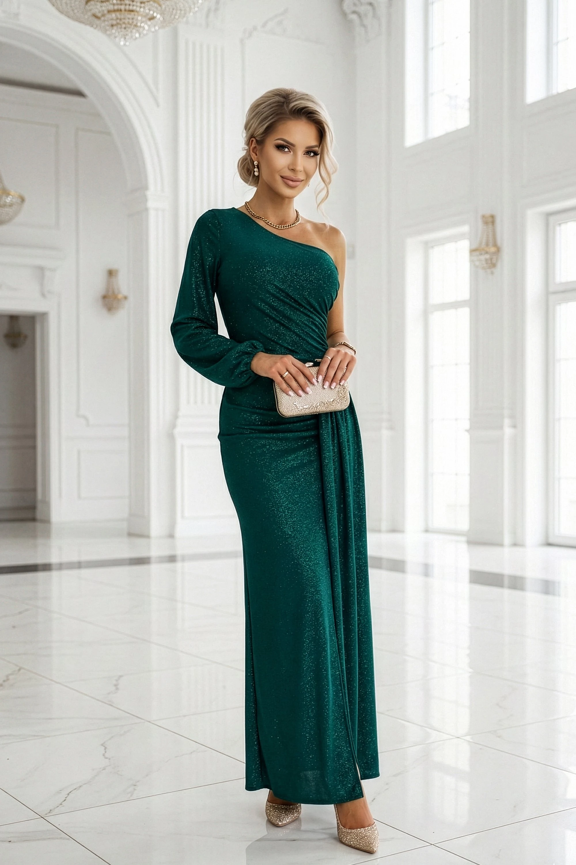 658-2 Połyskująca brokatowa sukienka maxi na jedno ramię z asymetrycznym rękawem i rozcięciem - butelkowa zieleń