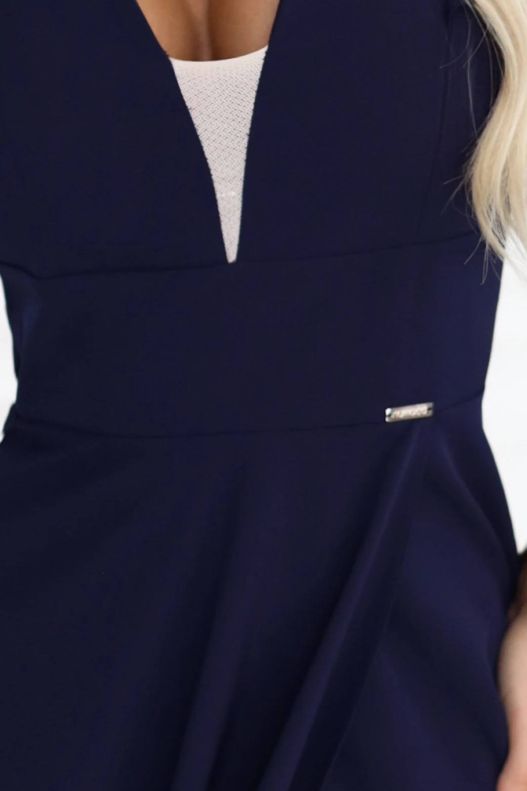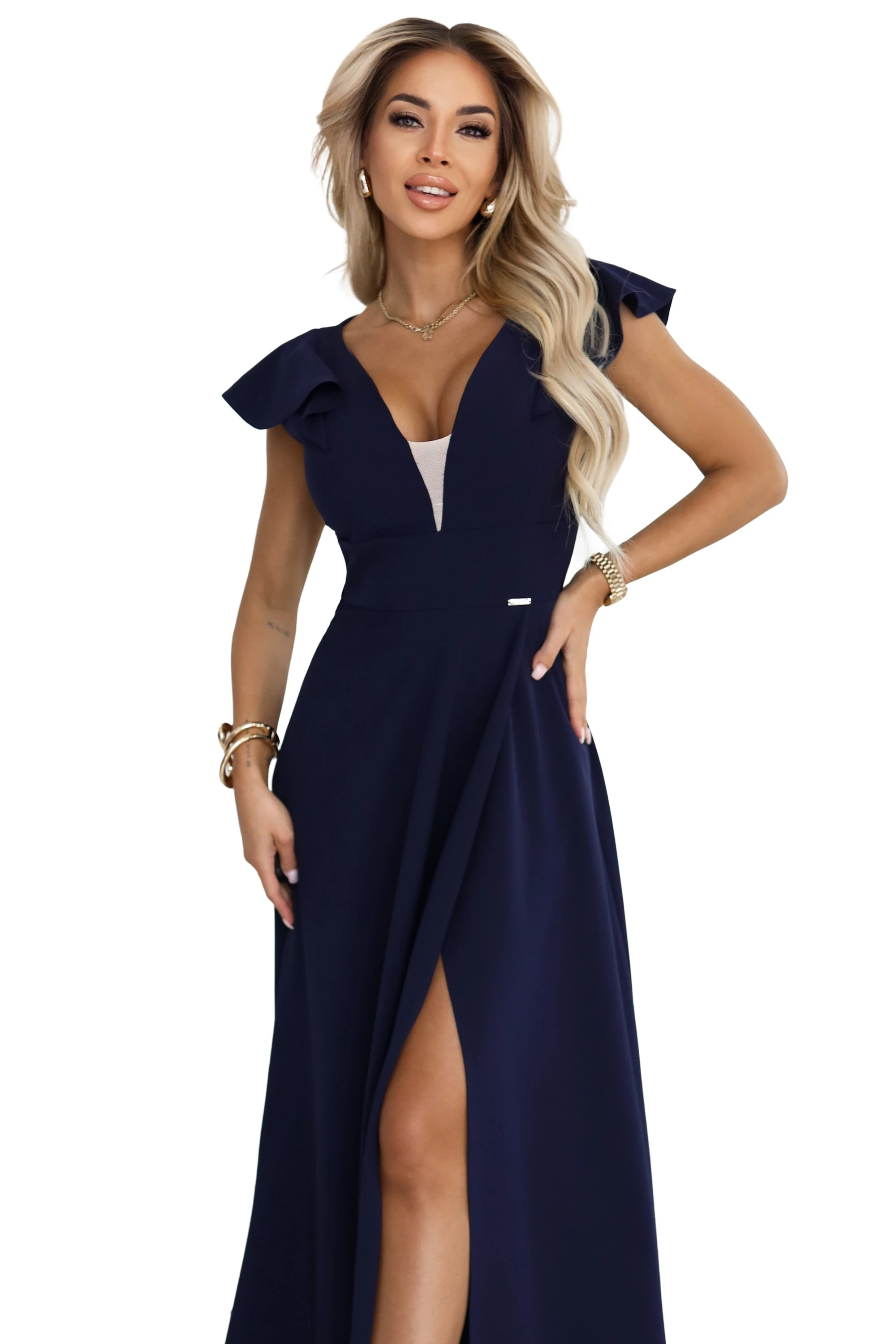 660-1 Elegancka sukienka maxi z falbankami, głębokim dekoltem i rozcięciem na nodze - granatowa