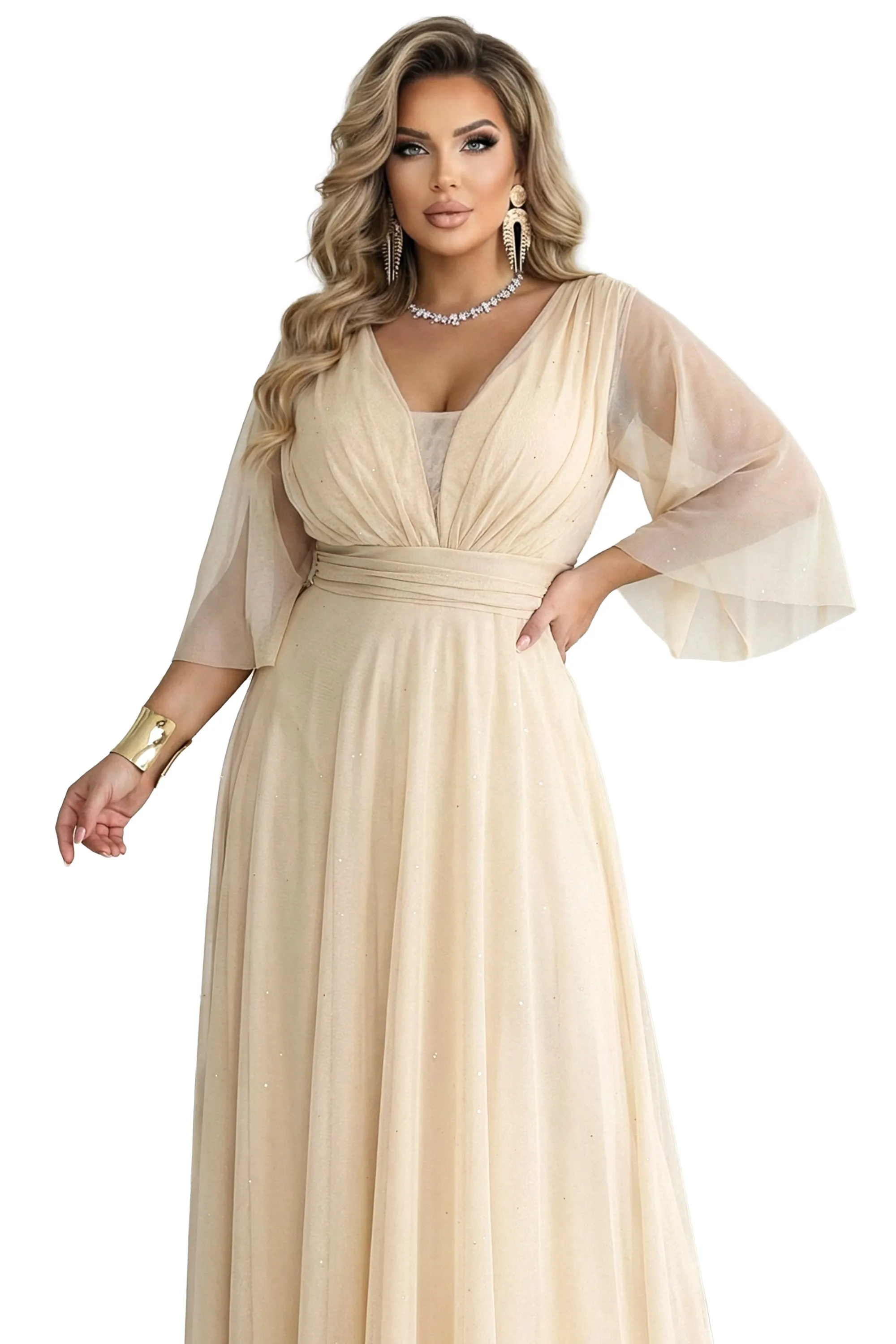 654-2 Długa połyskująca sukienka plus size z dekoltem i transparentnym rękawkiem - szampański beż