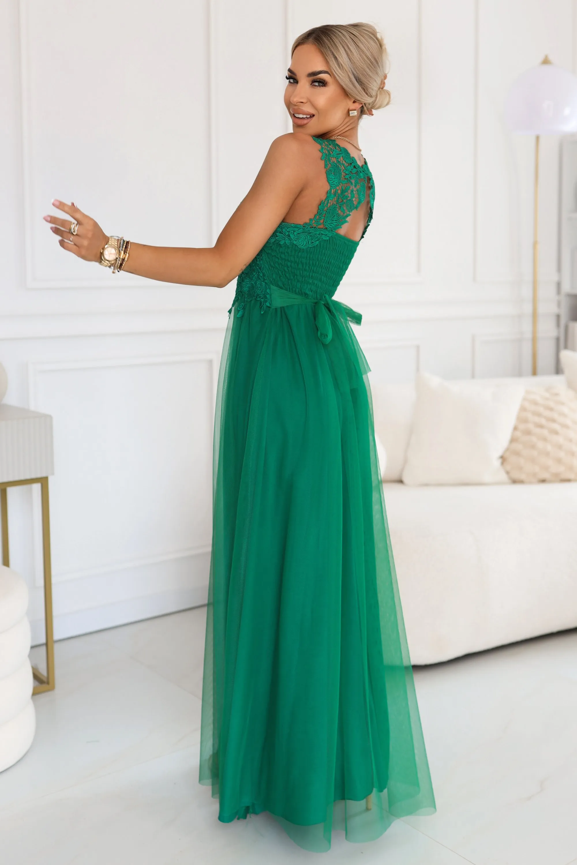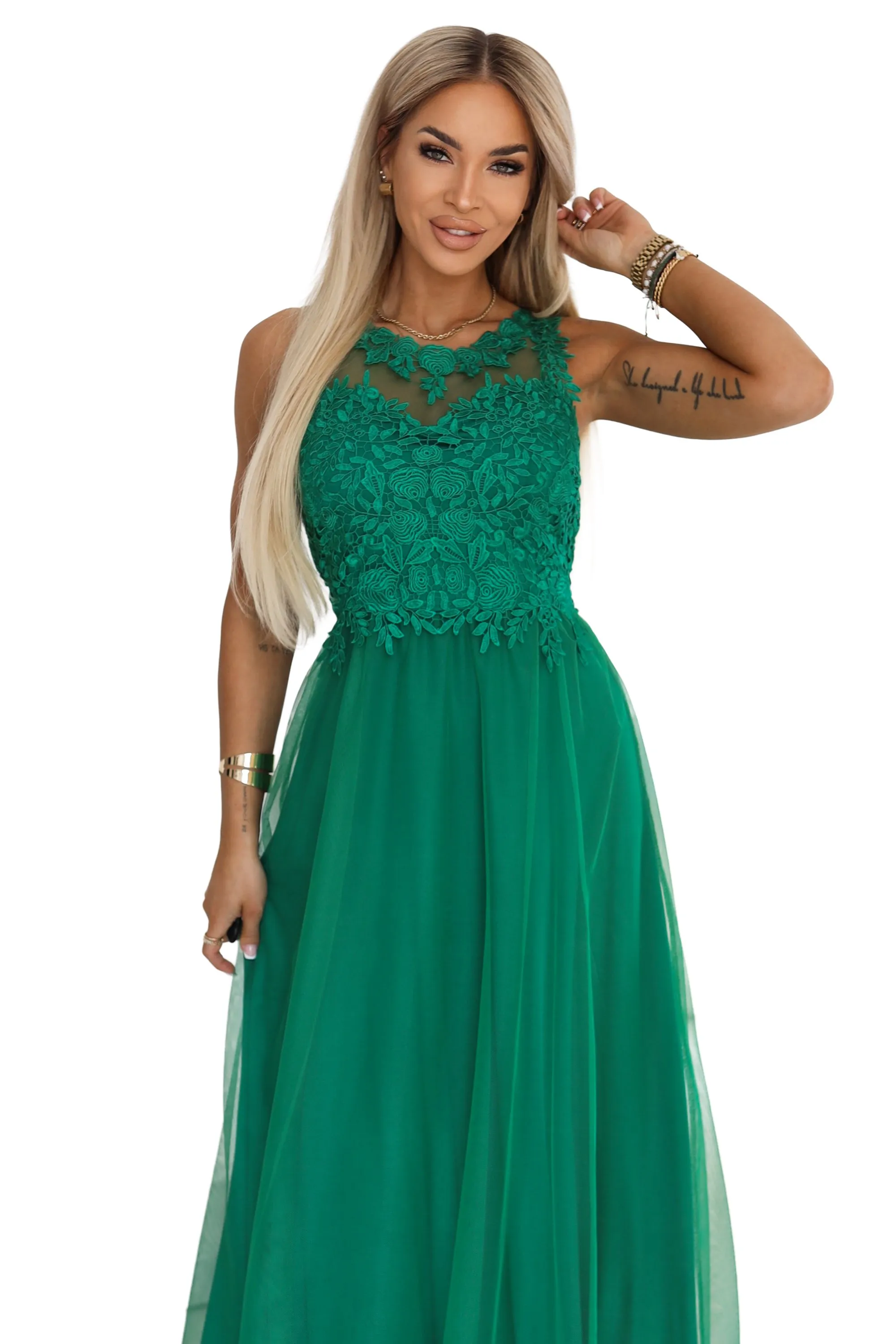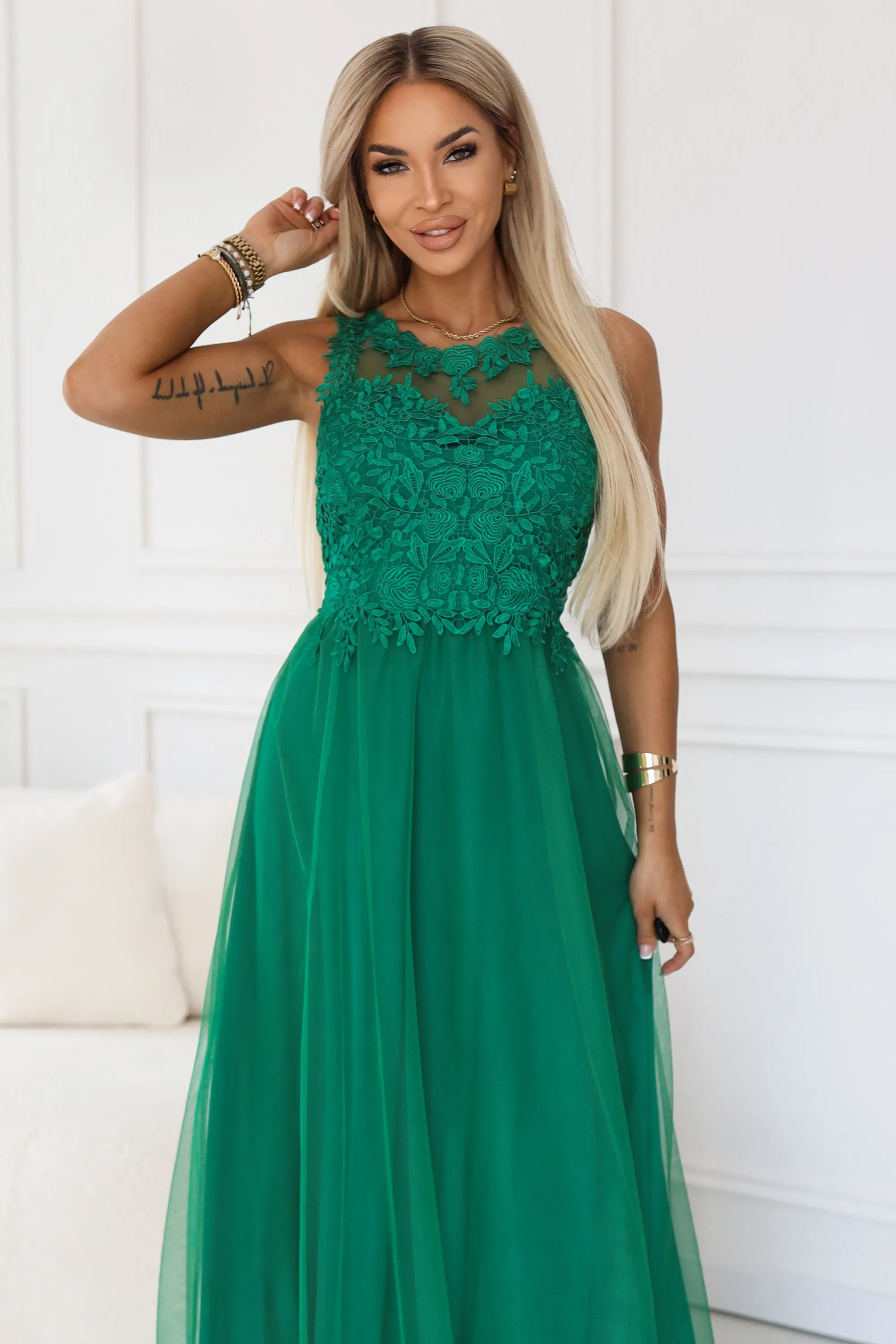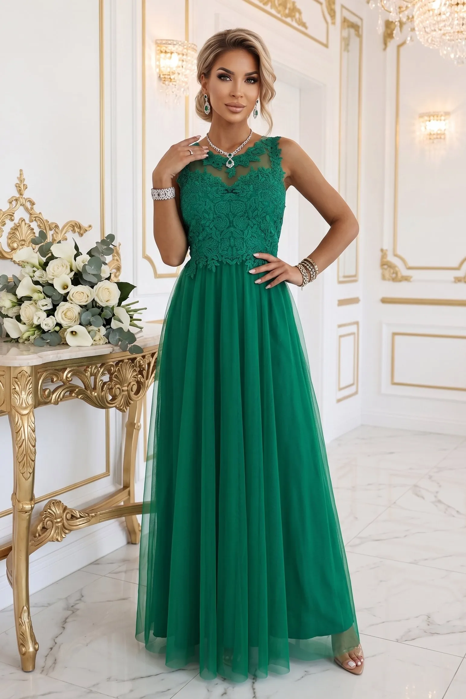672-3 Romantyczna suknia maxi na wesele z haftowaną koronką i tiulem - zielona